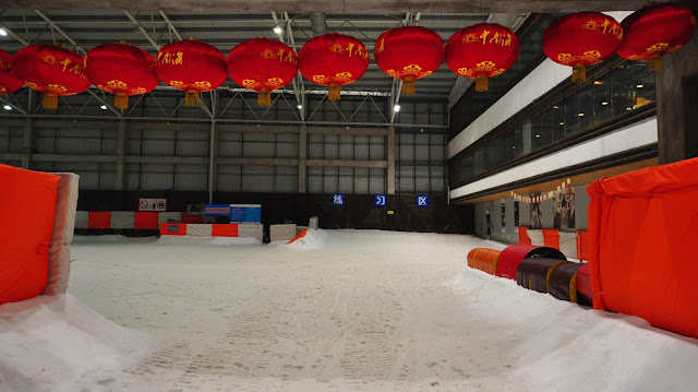 The ski hall is Qiaobo Ice and Snow World, situated in Shunyi, a small town somewhere behind Beijing's international airport. Qiaobo has two ski slopes, a wide and short beginners slope and a little bit longer main slope. In the main slope there are some jumps and rails for additional fun.